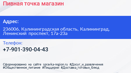 Пивная точка, магазин по адресу 236006, Калининградская область, Калининград, Ленинский проспект, 17а-23а в дальнейшем Организация, размещена в следующих категориях: