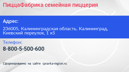 ПиццаФабрика, семейная пиццерия по адресу 236005, Калининградская область, Калининград, Киевский переулок, 1 к5 в дальнейшем Организация, размещена в следующих категориях: