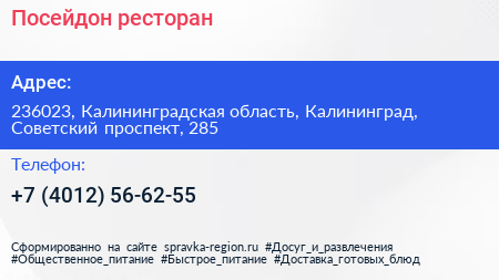 Посейдон, ресторан по адресу 236023, Калининградская область, Калининград, Советский проспект, 285 в дальнейшем Организация, размещена в следующих категориях: