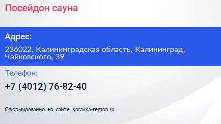 Посейдон, сауна по адресу 236022, Калининградская область, Калининград, Чайковского, 39 в дальнейшем Организация, размещена в следующих категориях: