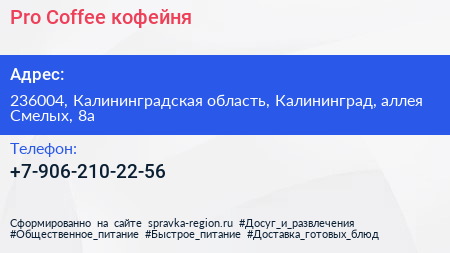 Pro.Coffee, кофейня по адресу 236004, Калининградская область, Калининград, аллея Смелых, 8а в дальнейшем Организация, размещена в следующих категориях:
