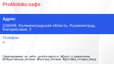 ProMoloko, кафе по адресу 236048, Калининградская область, Калининград, Кипарисовая, 3 в дальнейшем Организация, размещена в следующих категориях: