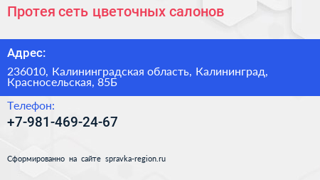 Протея, сеть цветочных салонов по адресу 236010, Калининградская область, Калининград, Красносельская, 85Б в дальнейшем Организация, размещена в следующих категориях: