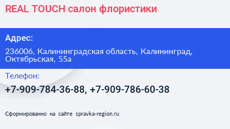 REAL TOUCH, салон флористики по адресу 236006, Калининградская область, Калининград, Октябрьская, 55а в дальнейшем Организация, размещена в следующих категориях: