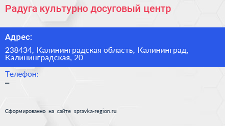 Радуга, культурно-досуговый центр по адресу 238434, Калининградская область, Калининград, Калининградская, 20 в дальнейшем Организация, размещена в следующих категориях: