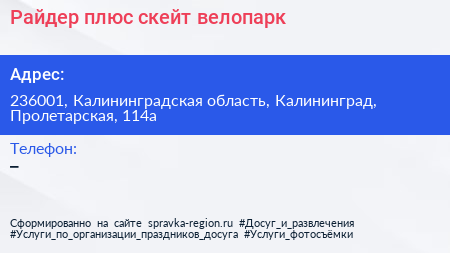Райдер плюс, скейт-велопарк по адресу 236001, Калининградская область, Калининград, Пролетарская, 114а в дальнейшем Организация, размещена в следующих категориях: