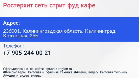 Ростерхит, сеть стрит-фуд кафе по адресу 236001, Калининградская область, Калининград, Колхозная, 26Б в дальнейшем Организация, размещена в следующих категориях: