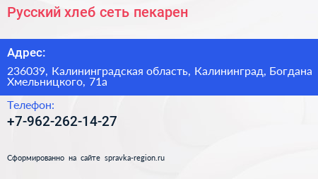 Русский хлеб, сеть пекарен по адресу 236039, Калининградская область, Калининград, Богдана Хмельницкого, 71а в дальнейшем Организация, размещена в следующих категориях: