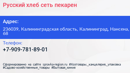 Русский хлеб, сеть пекарен по адресу 236039, Калининградская область, Калининград, Нансена, 68 в дальнейшем Организация, размещена в следующих категориях: