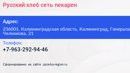 Русский хлеб, сеть пекарен по адресу 236001, Калининградская область, Калининград, Генерала Челнокова, 21 в дальнейшем Организация, размещена в следующих категориях: