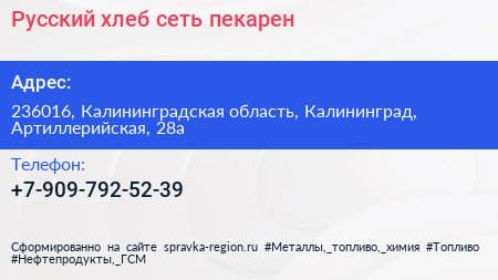 Русский хлеб, сеть пекарен по адресу 236016, Калининградская область, Калининград, Артиллерийская, 28а в дальнейшем Организация, размещена в следующих категориях: