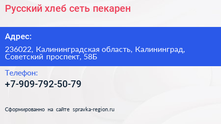 Русский хлеб, сеть пекарен по адресу 236022, Калининградская область, Калининград, Советский проспект, 58Б в дальнейшем Организация, размещена в следующих категориях: