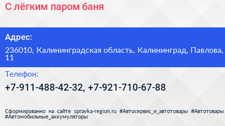С лёгким паром!, баня по адресу 236010, Калининградская область, Калининград, Павлова, 11 в дальнейшем Организация, размещена в следующих категориях: