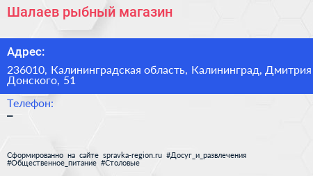 Шалаев, рыбный магазин по адресу 236010, Калининградская область, Калининград, Дмитрия Донского, 51 в дальнейшем Организация, размещена в следующих категориях: