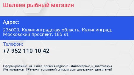 Шалаев, рыбный магазин по адресу 236003, Калининградская область, Калининград, Московский проспект, 185 к1 в дальнейшем Организация, размещена в следующих категориях: