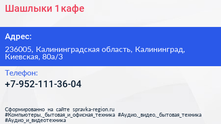 Шашлыки №1, кафе по адресу 236005, Калининградская область, Калининград, Киевская, 80а/3 в дальнейшем Организация, размещена в следующих категориях: