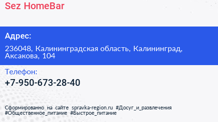 Sez HomeBar по адресу 236048, Калининградская область, Калининград, Аксакова, 104 в дальнейшем Организация, размещена в следующих категориях: