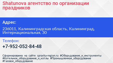 Shatunova, агентство по организации праздников по адресу 236011, Калининградская область, Калининград, Интернациональная, 30 в дальнейшем Организация, размещена в следующих категориях: