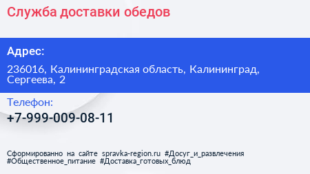 Служба доставки обедов по адресу 236016, Калининградская область, Калининград, Сергеева, 2 в дальнейшем Организация, размещена в следующих категориях: