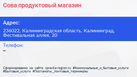 Сова, продуктовый магазин по адресу 236022, Калининградская область, Калининград, Фестивальная аллея, 20 в дальнейшем Организация, размещена в следующих категориях: