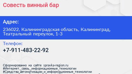 Совесть, винный бар по адресу 236022, Калининградская область, Калининград, Театральный переулок, 1-3 в дальнейшем Организация, размещена в следующих категориях: