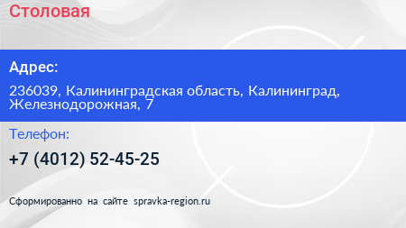 Столовая по адресу 236039, Калининградская область, Калининград, Железнодорожная, 7 в дальнейшем Организация, размещена в следующих категориях: