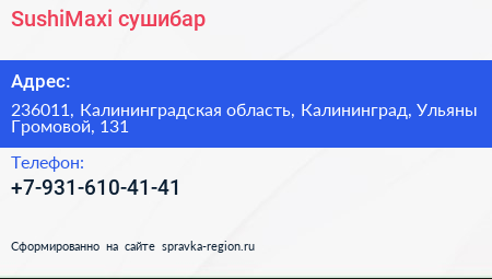 SushiMaxi, сушибар по адресу 236011, Калининградская область, Калининград, Ульяны Громовой, 131 в дальнейшем Организация, размещена в следующих категориях: