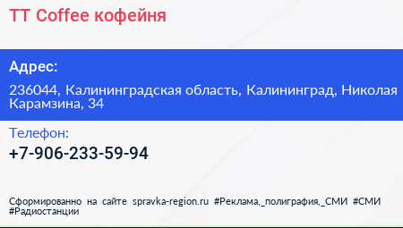 TT Coffee, кофейня по адресу 236044, Калининградская область, Калининград, Николая Карамзина, 34 в дальнейшем Организация, размещена в следующих категориях: