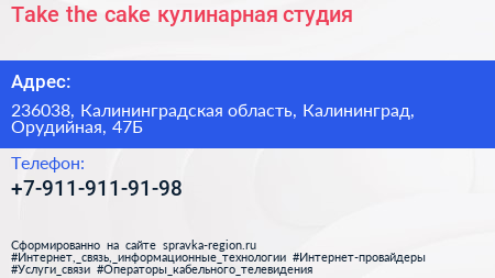 Take the cake, кулинарная студия по адресу 236038, Калининградская область, Калининград, Орудийная, 47Б в дальнейшем Организация, размещена в следующих категориях: