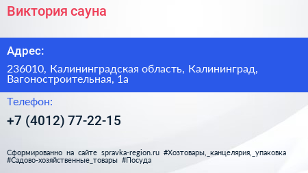 Виктория, сауна по адресу 236010, Калининградская область, Калининград, Вагоностроительная, 1а в дальнейшем Организация, размещена в следующих категориях: