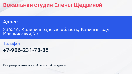 Вокальная студия Елены Щедриной по адресу 236016, Калининградская область, Калининград, Клиническая, 27 в дальнейшем Организация, размещена в следующих категориях: