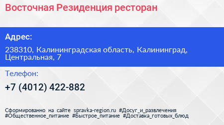 Восточная Резиденция, ресторан по адресу 238310, Калининградская область, Калининград, Центральная, 7 в дальнейшем Организация, размещена в следующих категориях: