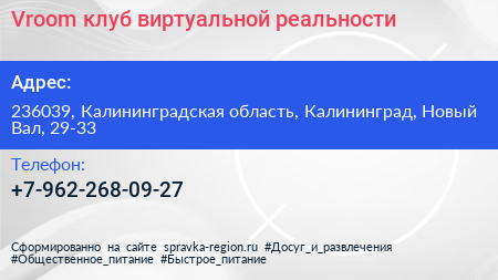Vroom, клуб виртуальной реальности по адресу 236039, Калининградская область, Калининград, Новый Вал, 29-33 в дальнейшем Организация, размещена в следующих категориях: