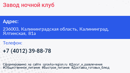 Завод, ночной клуб по адресу 236003, Калининградская область, Калининград, Ялтинская, 81а в дальнейшем Организация, размещена в следующих категориях: