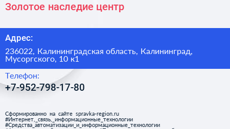 Золотое наследие, центр по адресу 236022, Калининградская область, Калининград, Мусоргского, 10 к1 в дальнейшем Организация, размещена в следующих категориях: