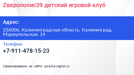 Zверополис39, детский игровой клуб по адресу 236006, Калининградская область, Калининград, Мариупольская, 14 в дальнейшем Организация, размещена в следующих категориях: