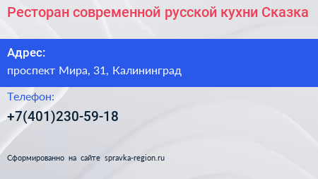 Ресторан современной русской кухни «Сказка» по адресу проспект Мира, 31, Калининград в дальнейшем Организация, размещена в следующих категориях: