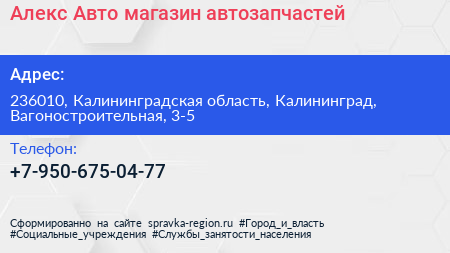Алекс-Авто, магазин автозапчастей по адресу 236010, Калининградская область, Калининград, Вагоностроительная, 3-5 в дальнейшем Организация, размещена в следующих категориях: