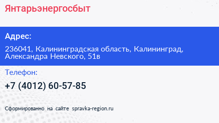 Янтарьэнергосбыт по адресу 236041, Калининградская область, Калининград, Александра Невского, 51в в дальнейшем Организация, размещена в следующих категориях: