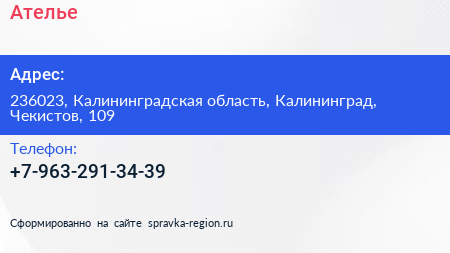 Ателье по адресу 236023, Калининградская область, Калининград, Чекистов, 109 в дальнейшем Организация, размещена в следующих категориях:
