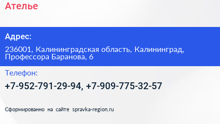 Ателье по адресу 236001, Калининградская область, Калининград, Профессора Баранова, 6 в дальнейшем Организация, размещена в следующих категориях: