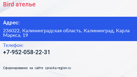 Bird, ателье по адресу 236022, Калининградская область, Калининград, Карла Маркса, 19 в дальнейшем Организация, размещена в следующих категориях: