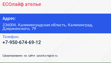 ECOлайф, ателье по адресу 236004, Калининградская область, Калининград, Дзержинского, 79 в дальнейшем Организация, размещена в следующих категориях: