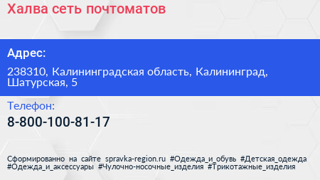 Халва, сеть почтоматов по адресу 238310, Калининградская область, Калининград, Шатурская, 5 в дальнейшем Организация, размещена в следующих категориях: