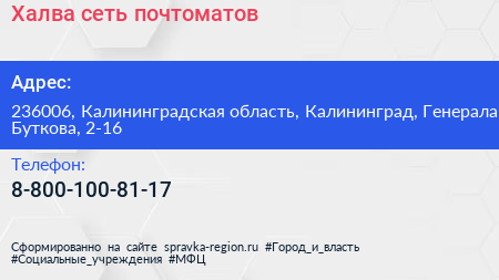 Халва, сеть почтоматов по адресу 236006, Калининградская область, Калининград, Генерала Буткова, 2-16 в дальнейшем Организация, размещена в следующих категориях: