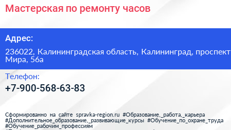 Мастерская по ремонту часов по адресу 236022, Калининградская область, Калининград, проспект Мира, 56а в дальнейшем Организация, размещена в следующих категориях: