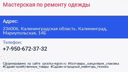 Мастерская по ремонту одежды по адресу 236006, Калининградская область, Калининград, Мариупольская, 14Б в дальнейшем Организация, размещена в следующих категориях: