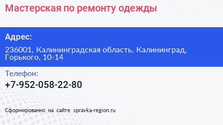 Мастерская по ремонту одежды по адресу 236001, Калининградская область, Калининград, Горького, 10-14 в дальнейшем Организация, размещена в следующих категориях: