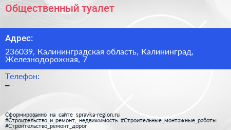 Общественный туалет по адресу 236039, Калининградская область, Калининград, Железнодорожная, 7 в дальнейшем Организация, размещена в следующих категориях: