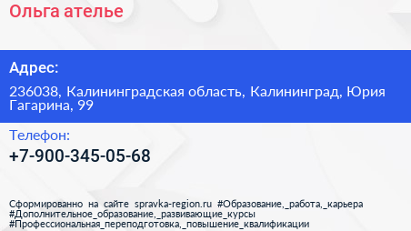 Ольга, ателье по адресу 236038, Калининградская область, Калининград, Юрия Гагарина, 99 в дальнейшем Организация, размещена в следующих категориях: